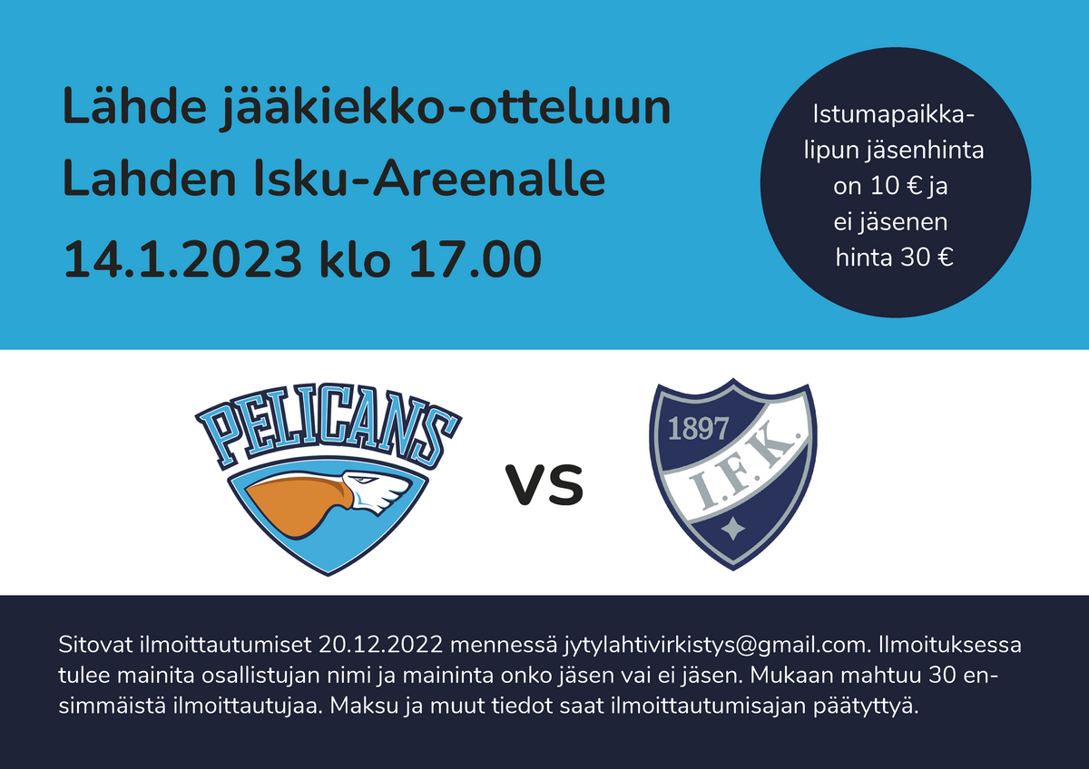 Lähde jääkiekko-otteluun Lahden Isku-Areenalle 14.1.2023 klo 17.00